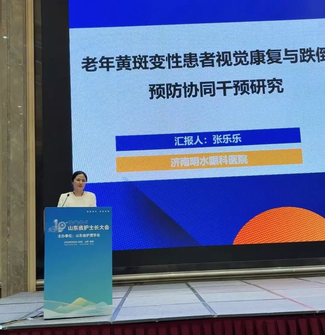 医院眼底病科护士长张乐乐凭借论文《老年黄斑变性患者视觉康复与跌倒预防协同干预研究》,受邀在大会分论坛进行专题发言。
