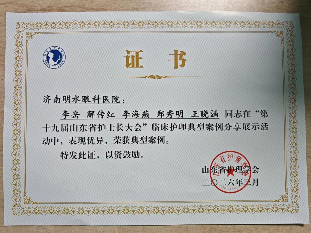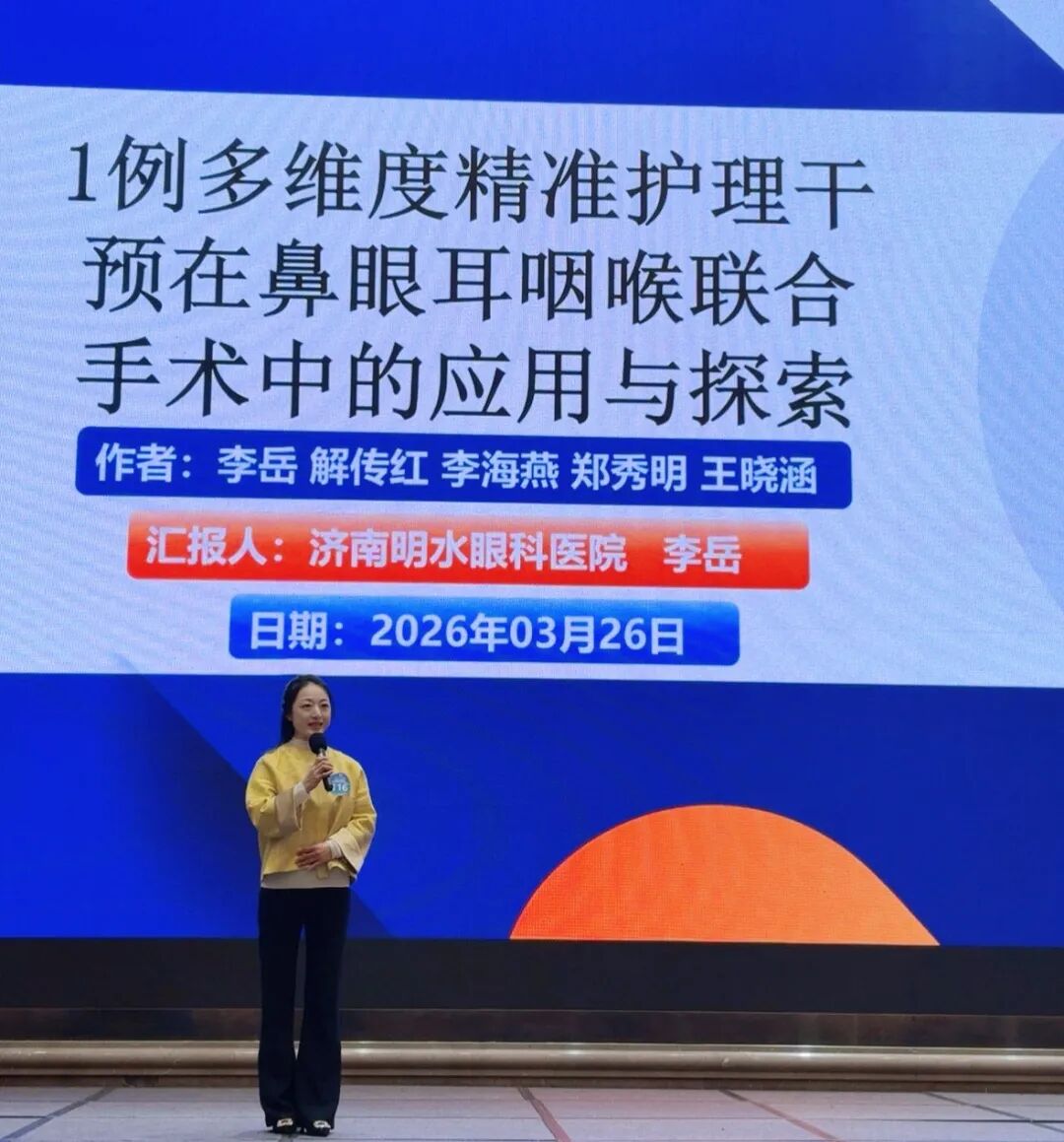 由手术室护士李岳、解传红、李海燕、郑秀明、王晓涵共同完成的《一例多维度精准护理干预在鼻眼耳咽喉联合手术中的应用与探索》获评典型案例奖。案例针对一名合并多种基础疾病的12岁患者,实施多学科联合手术下的全流程精准护理,成功规避风险,患者恢复良好,获得家属高度认可。此外,李岳撰写的论文《眼科手术室护士人文素养提升与培训体系建设》也被大会录用,并做电子壁报展示。